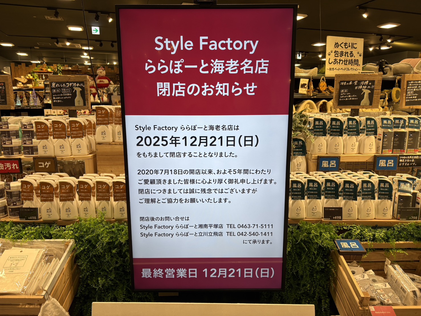 ららぽーと海老名にある、カインズ(CAINZ)が展開するライフスタイルDIY ショップ「Style Factory(スタイルファクトリー)」が、2025年12月21日(日)をもって閉店するそうです。
