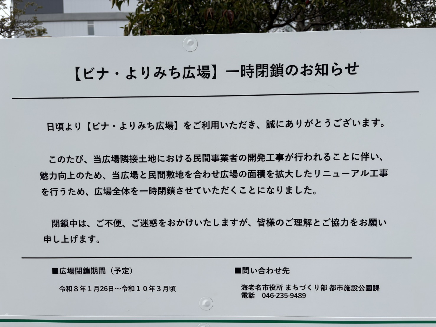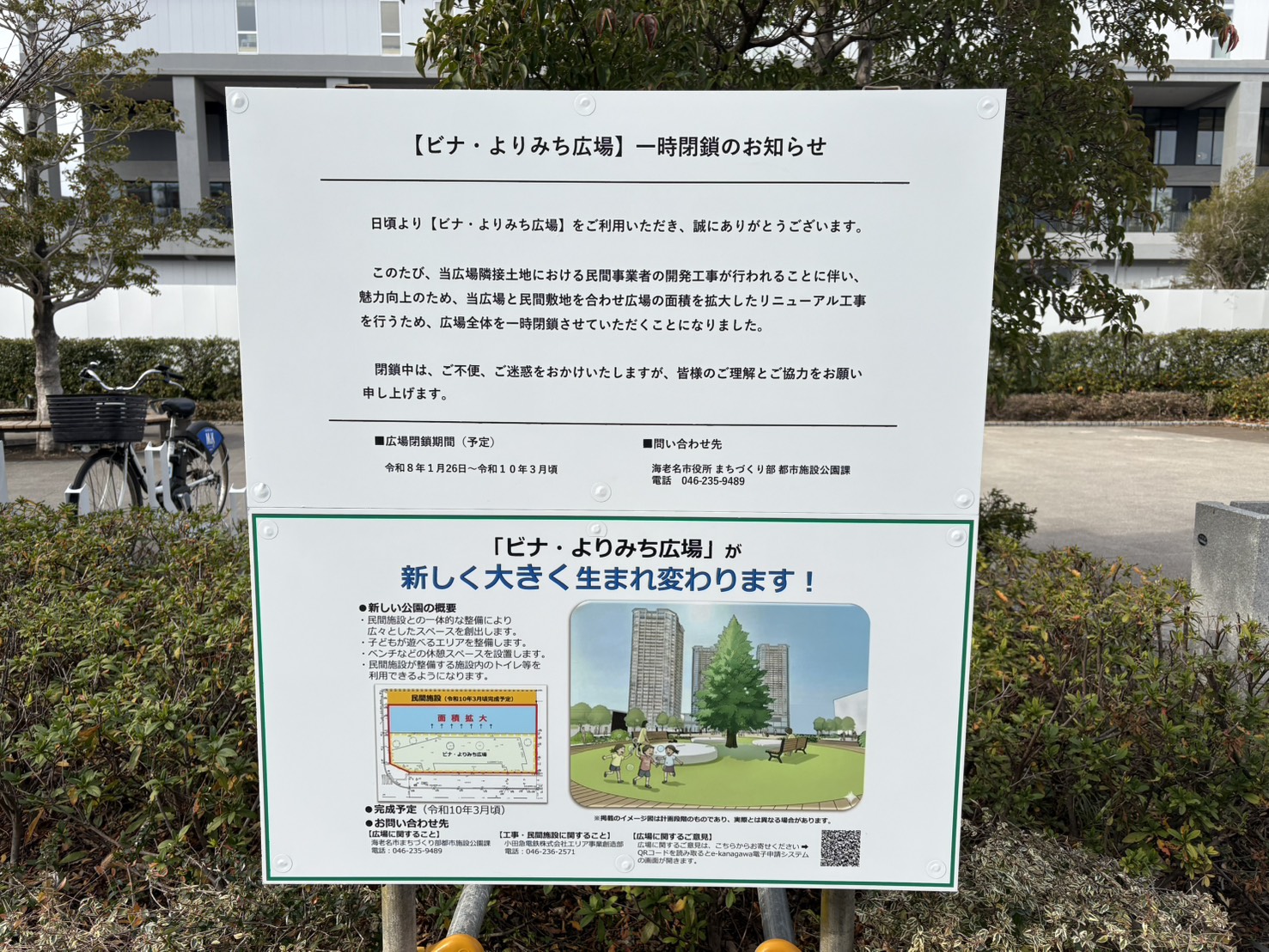 最後に繰り返しとなりますが、「ビナ・よりみち広場」は2026年1月26日(月)から一時閉鎖となり、リニューアル後は2028年3月頃の完成予定です。