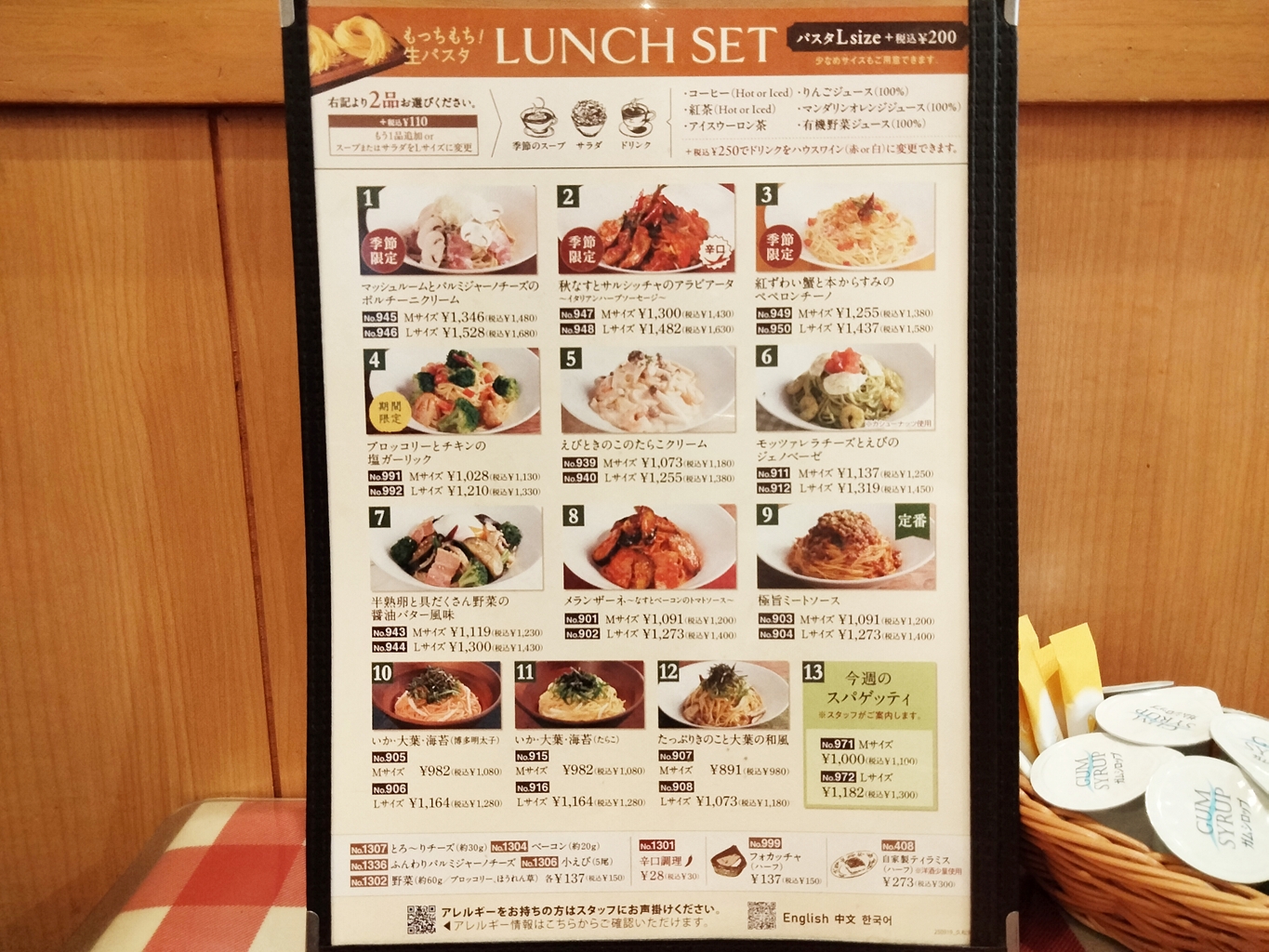 ランチはメインのパスタに加え、サラダorスープorドリンクから2品選べるセットとなっており、