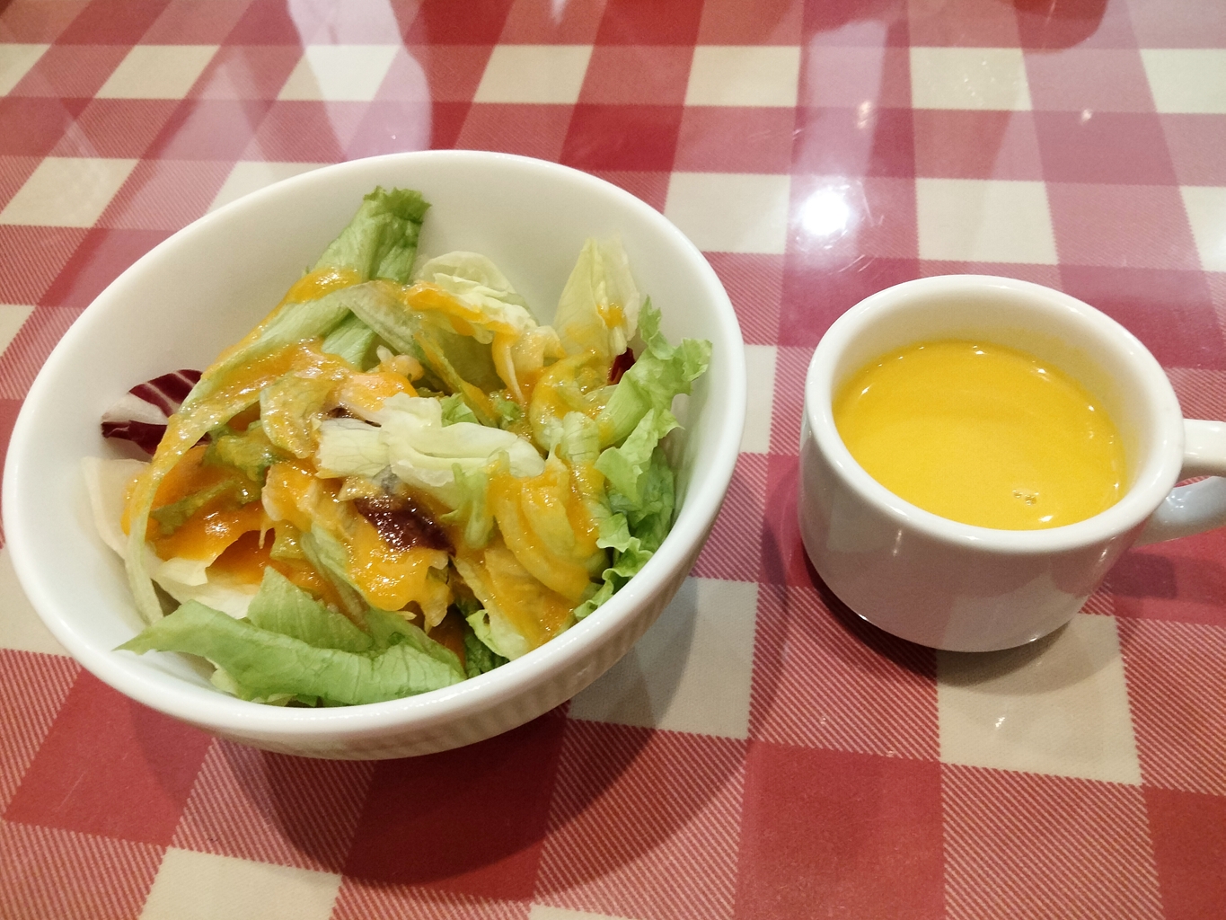サラダにはお店オリジナルというにんじんドレッシングがたっぷりかかっていました!