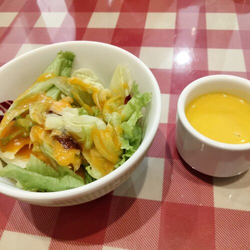 サラダにはお店オリジナルというにんじんドレッシングがたっぷりかかっていました!