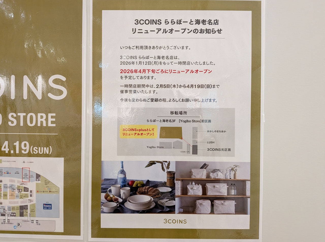 2026年4月下旬ごろ「3COINS+plus」として、リニューアルオープン予定だってー!