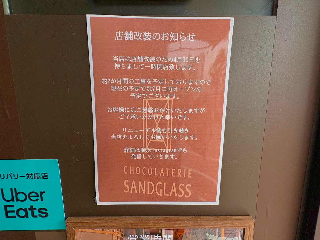 ビナウォーク2番館1Fにある「ショコラトリー サンドグラス」が、店舗改装のため4月30日(木)をもって一時閉店するそうです。