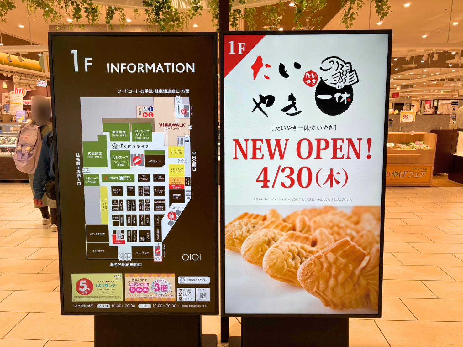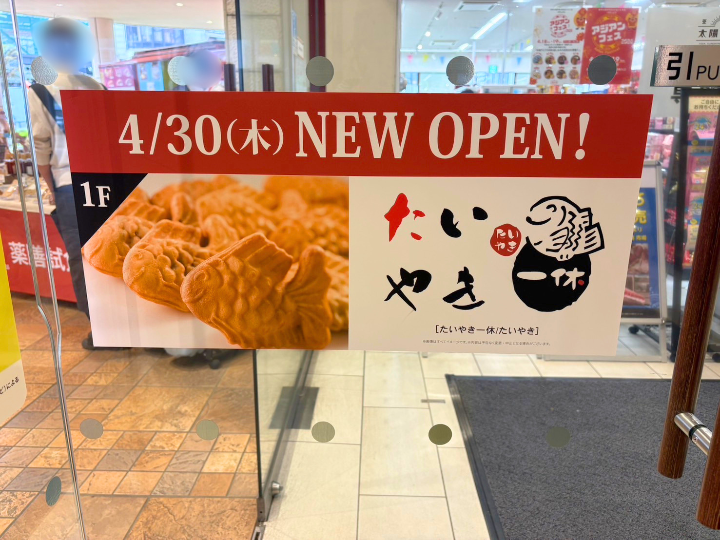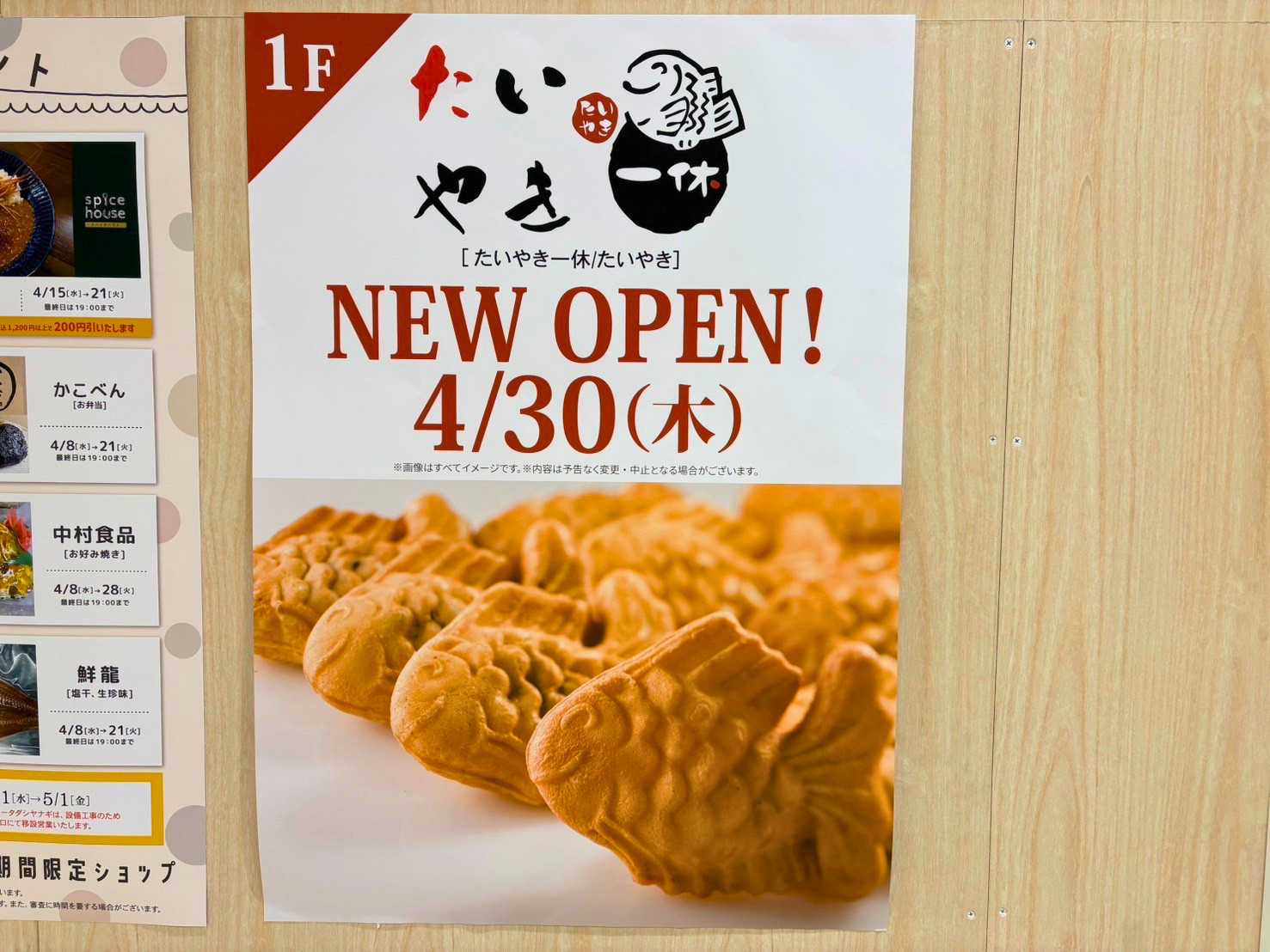 掲示によると、「たいやき 一休」が4月30日(木)に新規オープンとのこと。
