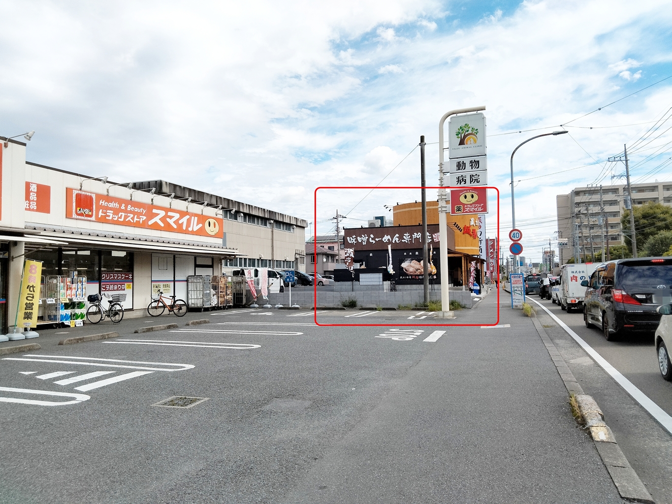 「河原口」交差点すぐそば、「ドラッグストアスマイル 海老名河原口店」のお隣にあります。