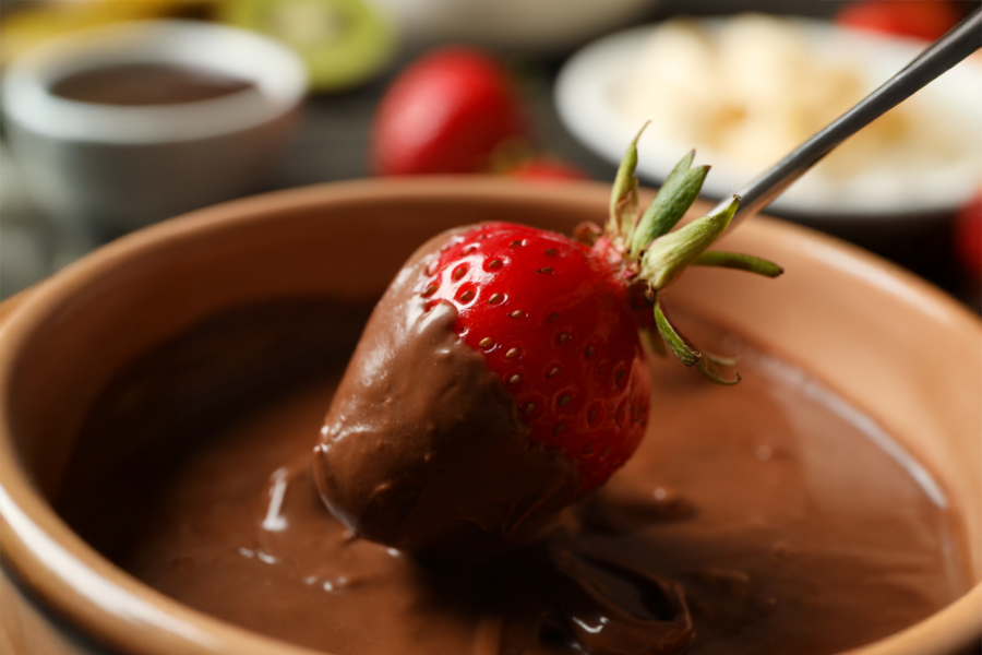 お楽しみコーナー: 苺のチョコフォンデュが楽しめるチョコレートファウンテンや、自分で作るオリジナルパフェコーナーも!