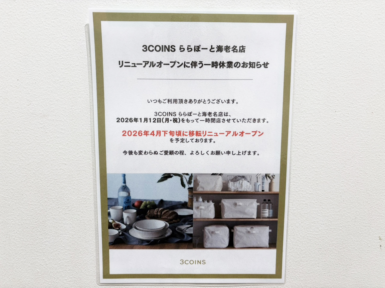「3COINS ららぽーと海老名店」1月12日(月・祝)で一時閉店。2026年4月下旬頃に移転リニューアルオープン予定。