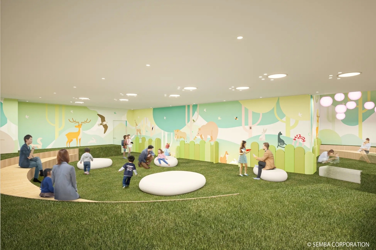親子で過ごせるキッズスペースがあり、ハイハイのお子さん・芝生広場で遊びたいお子さんがそれぞれ遊べる空間ができるんだって!
