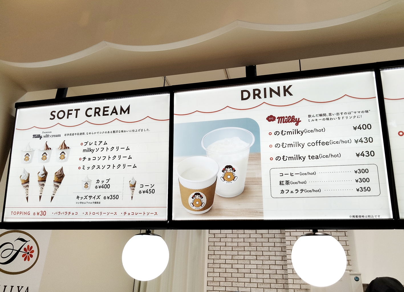 おおお!大人気商品の「プレミアムmilkyソフトクリーム」や「のむmilky」なども取り扱いがあるのですねー♡