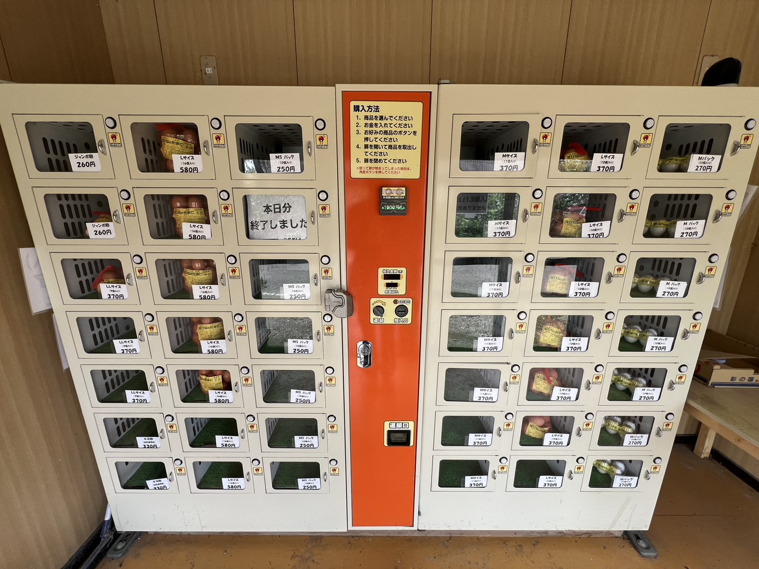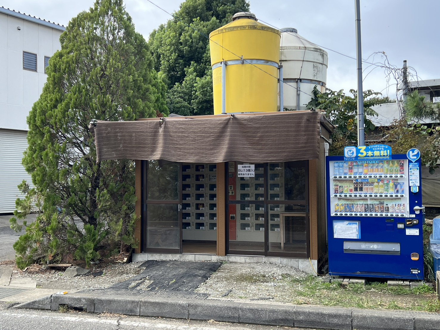 すると左手に鶏舎がみえ、その奥に自動販売機が設置されている小屋があります。