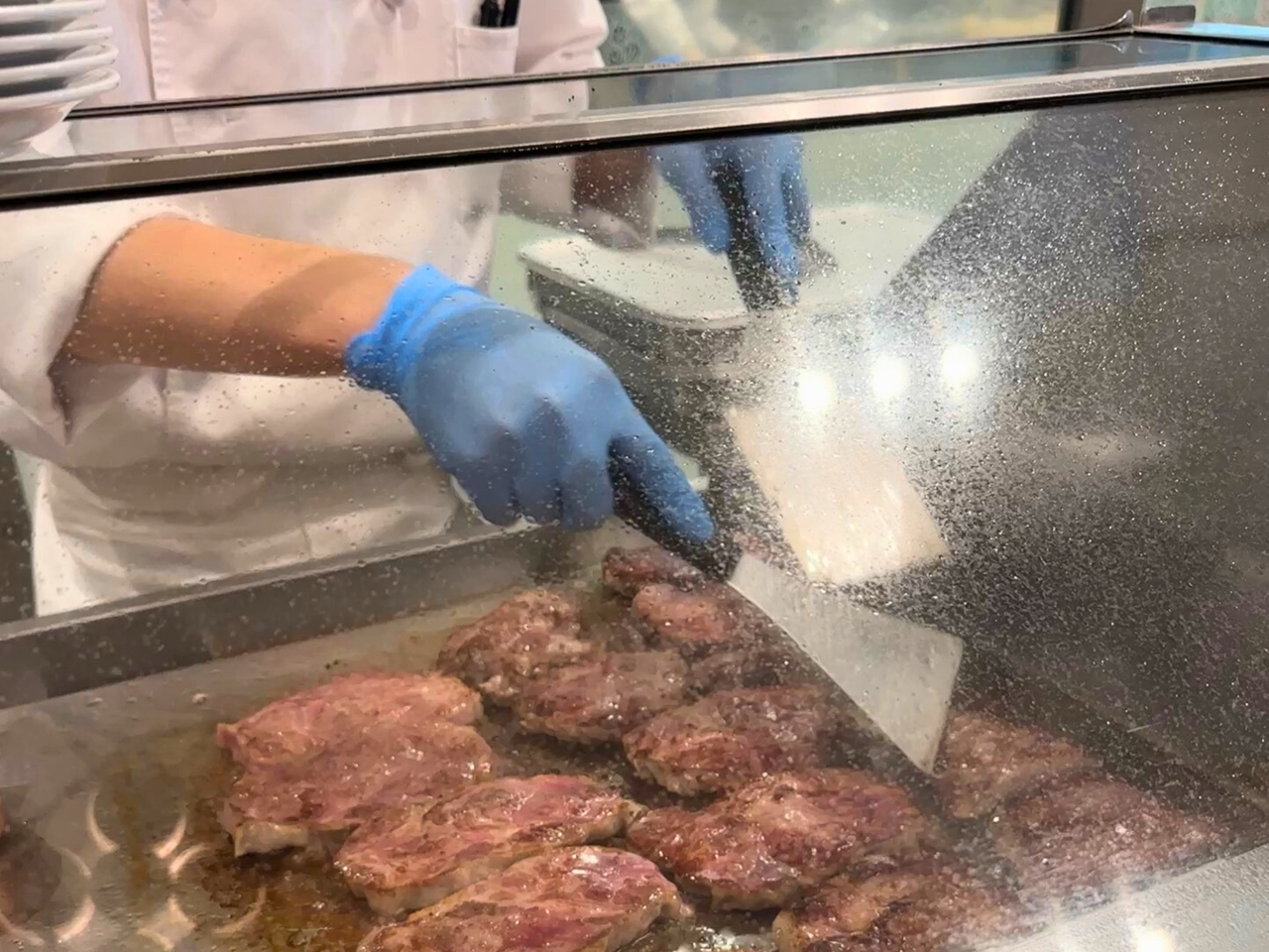 シェフが目の前で焼きあげる牛ステーキを提供。